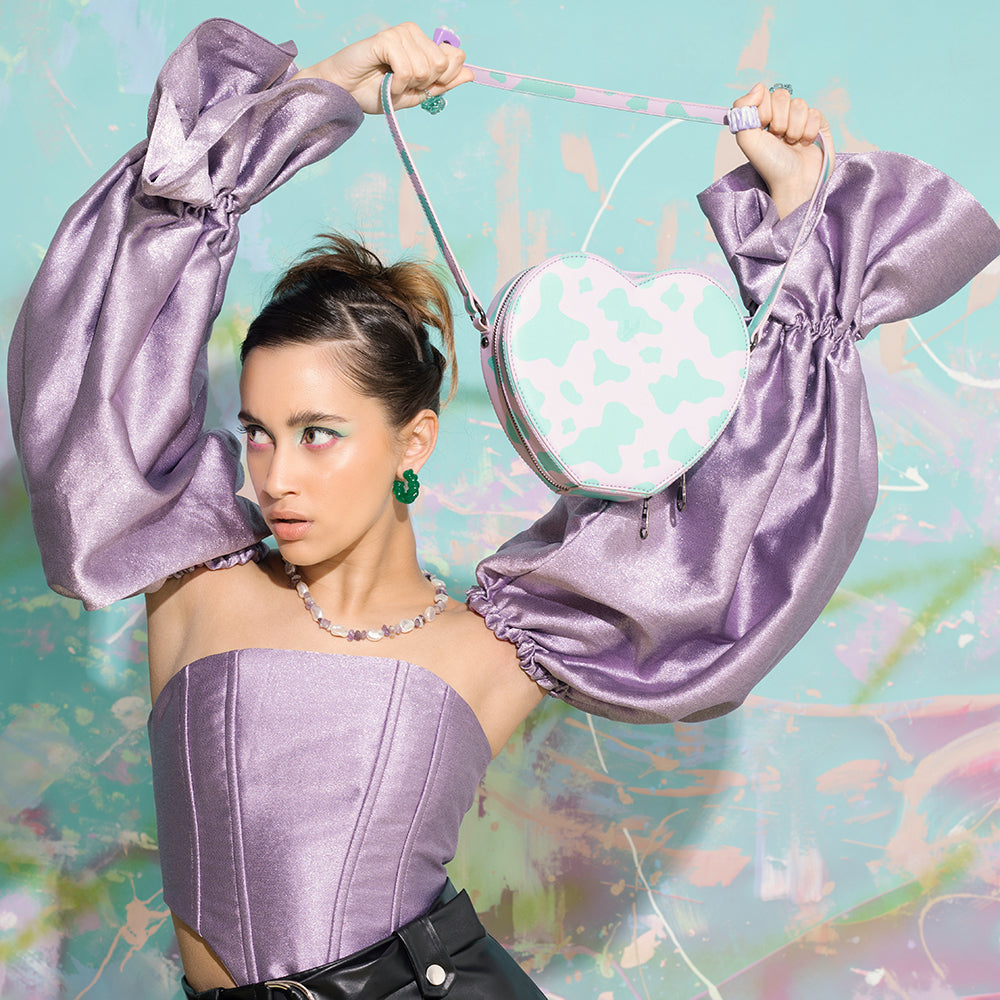Funky goddesses, please shower some love on me! This shoulder bag has an overall cow print, made from smooth vegan leather, has the shape of a heart, a top zipper and short strap.